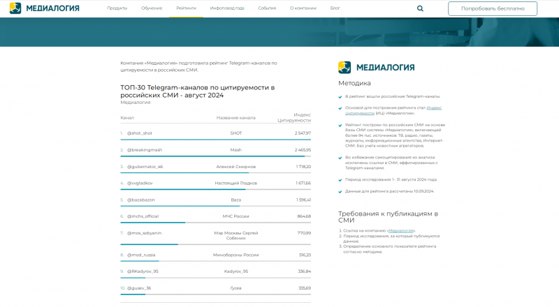 Символично, что в рейтинге «Медиалогии» среди самых цитируемых Telegram -каналов российских СМИ по итогам августа канал Алексея Смирнова также занял лидирующие позиции . Он расположился на третьем месте с топ-30. Рейтинг составлялся по российским СМИ на основе базы системы «Медиалогия», включающей более 94 тысяч источников: ТВ, радио, газеты, журналы, информационные агентства и интернет-СМИ. В итоговой таблице по цитируемости Telegram -канала руководитель Курской области опередил своего коллегу Вячеслава Гладкова, мэра Москвы Сергея Собянина и главу Чеченской Республики Рамзана Кадырова.