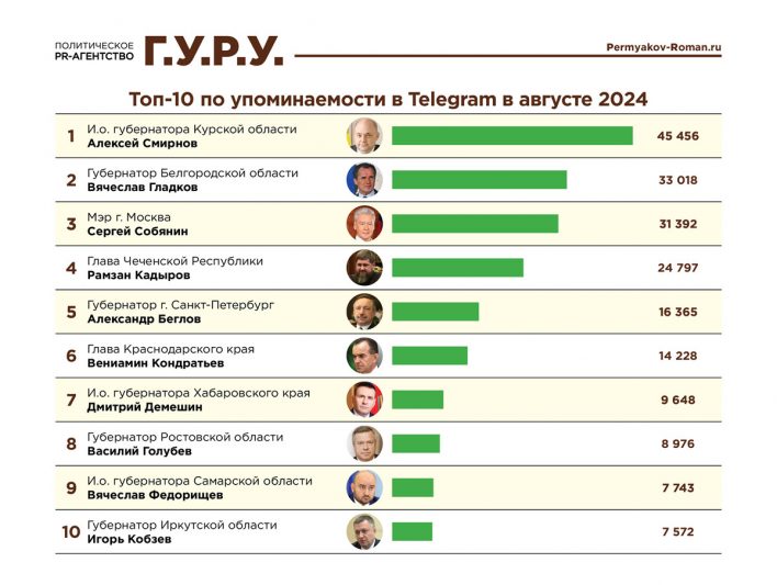 Информагентство «Телестрим» вместе с PR-агентством «Г.У.Р.У» представило обновлённый рейтинг эффективности публичных политиков через призму Telegram. Для его составления авторы использовали нейросеть собственной разработки, которая фиксирует публикации с упоминанием глав российских регионов в Telegram-каналах.