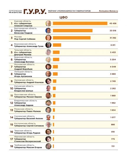 По итогам августа руководитель Курской области Алексей Смирнов возглавил рейтинг упоминаемости губернаторов, а также занял первое место в Центральном Федеральном округе. В топ-10 самых упоминаемых губернаторов Смирнов вошёл и по результатам сентябрьского мониторинга Telegram-каналов. Губернатора Курской области упоминали 45 456 раз. Наряду с региональными, о нём писали и федеральные информагентства и новостные паблики.