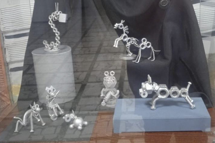 В экспозиции выставки – мини-скульптуры, сделанные слесарем Сергеем Пахомовым из гаек, шайб, шестерней, цепных передач и подшипников. Умелец собрал их вместе и превратил в экзотических зверей, насекомых и музыкантов. Среди его работ есть и военная техника.