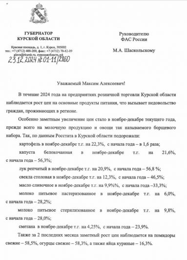 Врио губернатора Курской области направил официальное обращение руководителю ФАС России Максиму Шаскольскому с просьбой проверить ценообразование основных продуктов питания. Александр Хинштейн прислушался к жителям региона, которые обеспокоены резким ростом цен.