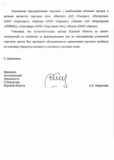Врио губернатора Курской области направил официальное обращение руководителю ФАС России Максиму Шаскольскому с просьбой проверить ценообразование основных продуктов питания. Александр Хинштейн прислушался к жителям региона, которые обеспокоены резким ростом цен.