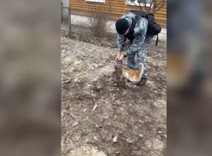 Доставляя гуманитарную помощь жителям приграничья, стражи порядка кормят животных, хозяева которых вынуждено покинули дома.