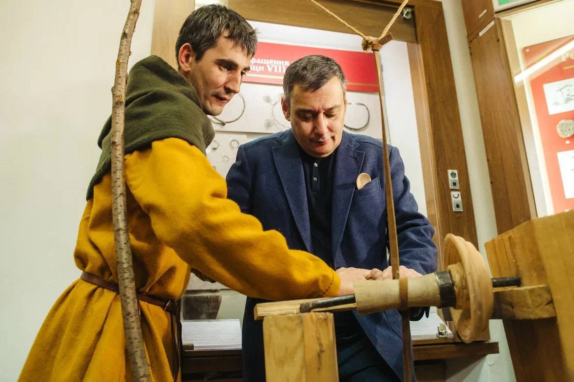 Посетил выставку и врио главы региона Александр Хинштейн. Ему продемонстрировали токарный станок, сделанный по старинным чертежам.