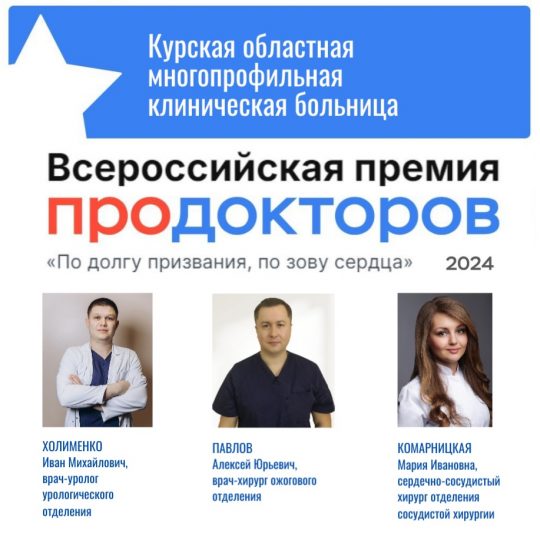 Были подведены итоги Всероссийской премии ПроДокторов-2024 «По долгу призвания, по зову сердца». Курская областная многопрофильная клиническая больница вошла в топ-10 государственных клиник Курской области. Лучшими в рейтинге Курской области, по мнению пациентов, стали трое врачей Курской ОМКБ: