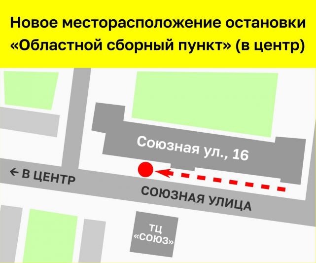 Теперь транспорт, движущийся в направлении к центру города, будет останавливаться напротив торгового центра «Союз». Настоятельно рекомендуем учитывать эту информацию при расчете времени на дорогу.