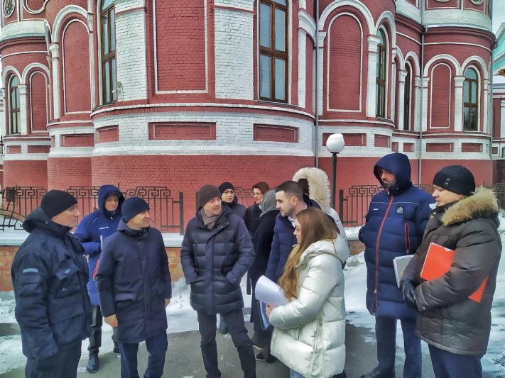 Далее, осмотрели замороженный в прямом и переносном смыслах фонтан рядом с площадью героев Курской битвы, за ним «Боевку». После комиссия переместилась на Верхнюю Казацкую к одной из старейших церквей города — храму святого Михаила, здание которого в настоящий момент находится в процессе реставрации, проходящей, как выяснилось, с замедленными темпами.
