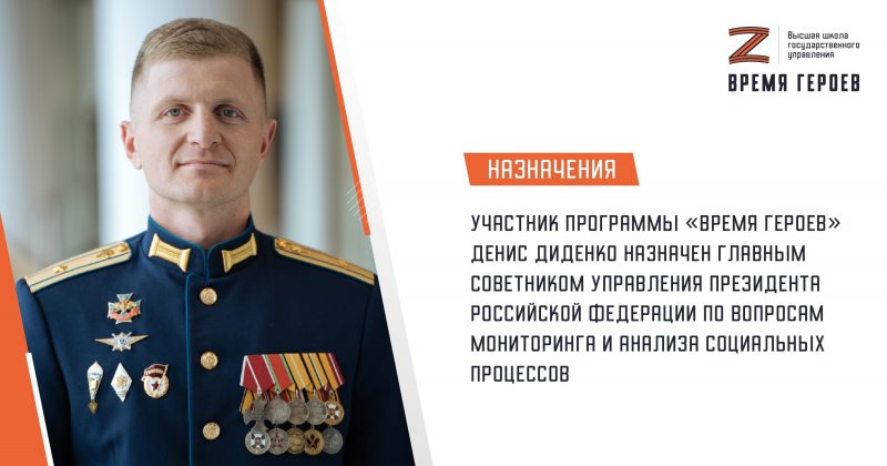 Кавалера ордена Мужества, участника кадровой программы «Время героев» Дениса Диденко назначили на должность главного советника Управления Президента Российской Федерации по вопросам мониторинга и анализа социальных процессов.
