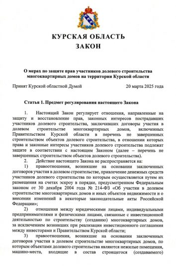 Накануне, 26 марта, врио губернатора Александр Хинштейн подписал закон, который позволит защитить права участников долевого строительства в Курской области. Он отметил, что проблемы обманутых дольщиков уже решены по всей стране, но в Курской области таковые ещё есть.