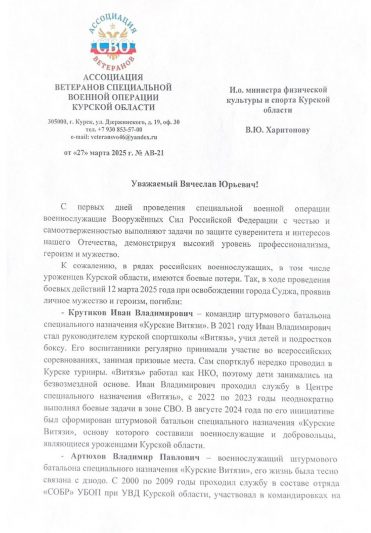 Председатель Ассоциации ветеранов СВО Курской области Дмитрий Гулиев совместно с Минспортом Курской области договорились о внесении в ежегодный календарь турниров по боксу и дзюдо памяти героически погибших при выполнении воинского долга Ивана Крутикова и Владимира Артюхова.