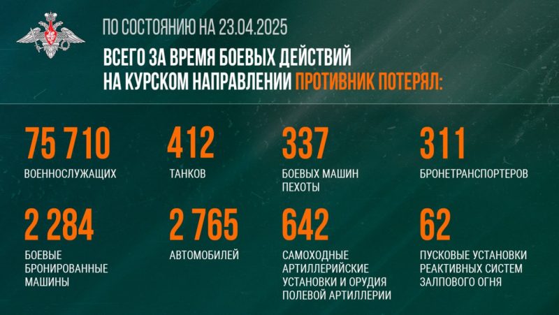 В общей сложности за время боевых действий на Курском направлении украинские формирования потеряли более 75 710 военнослужащих.