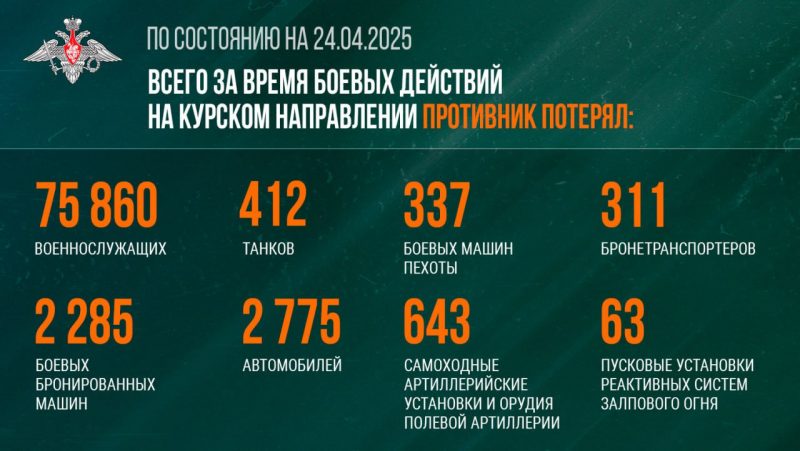 В общей сложности за время боевых действий в курском приграничье украинские формирования потеряли более 75 860 военнослужащих.
