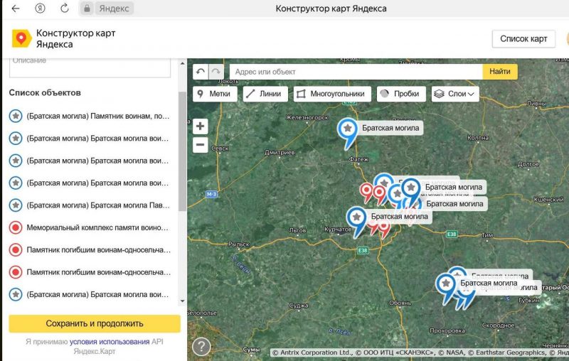 В конструкторе Яндекс-карт школьники нанесли обелиски с координатами, а также сопроводили информацией по каждому из них.