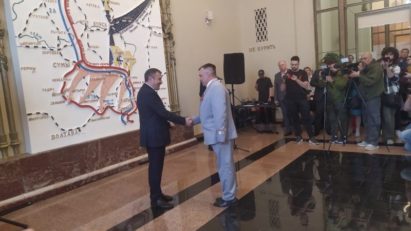 Врио губернатора Курской области Александр Хинштейн и начальник Московской железной дороги Павел Иванов вручили региональные и ведомственные награды самым активным волонтерам, оказывающим помощь воинам СВО. Также участники церемонии осмотрели еще один подарок для воинов — передвижной железнодорожный банный комплекс.