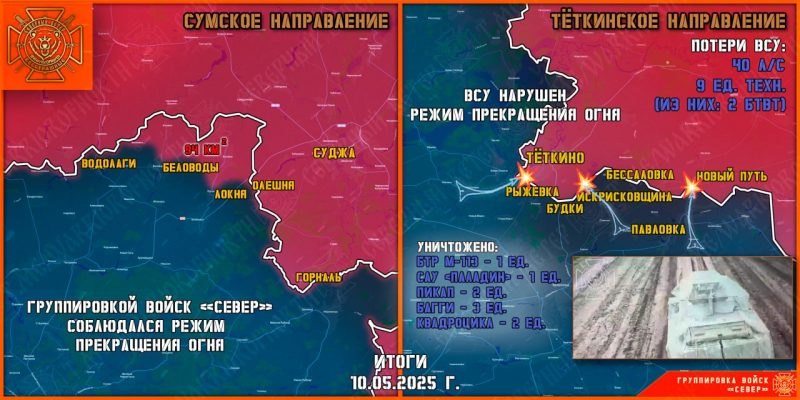 Несмотря на соглашение о временном прекращении огня, ВСУ 10 мая предприняли несколько попыток прорыва на территорию Курской области в районе населенных пунктов Теткино и Новый Путь. Все диверсии предотвратили бойцы группировки войск «Север». Они уничтожили штурмовые подразделения противника на Тёткинском и Глушковском направлениях.