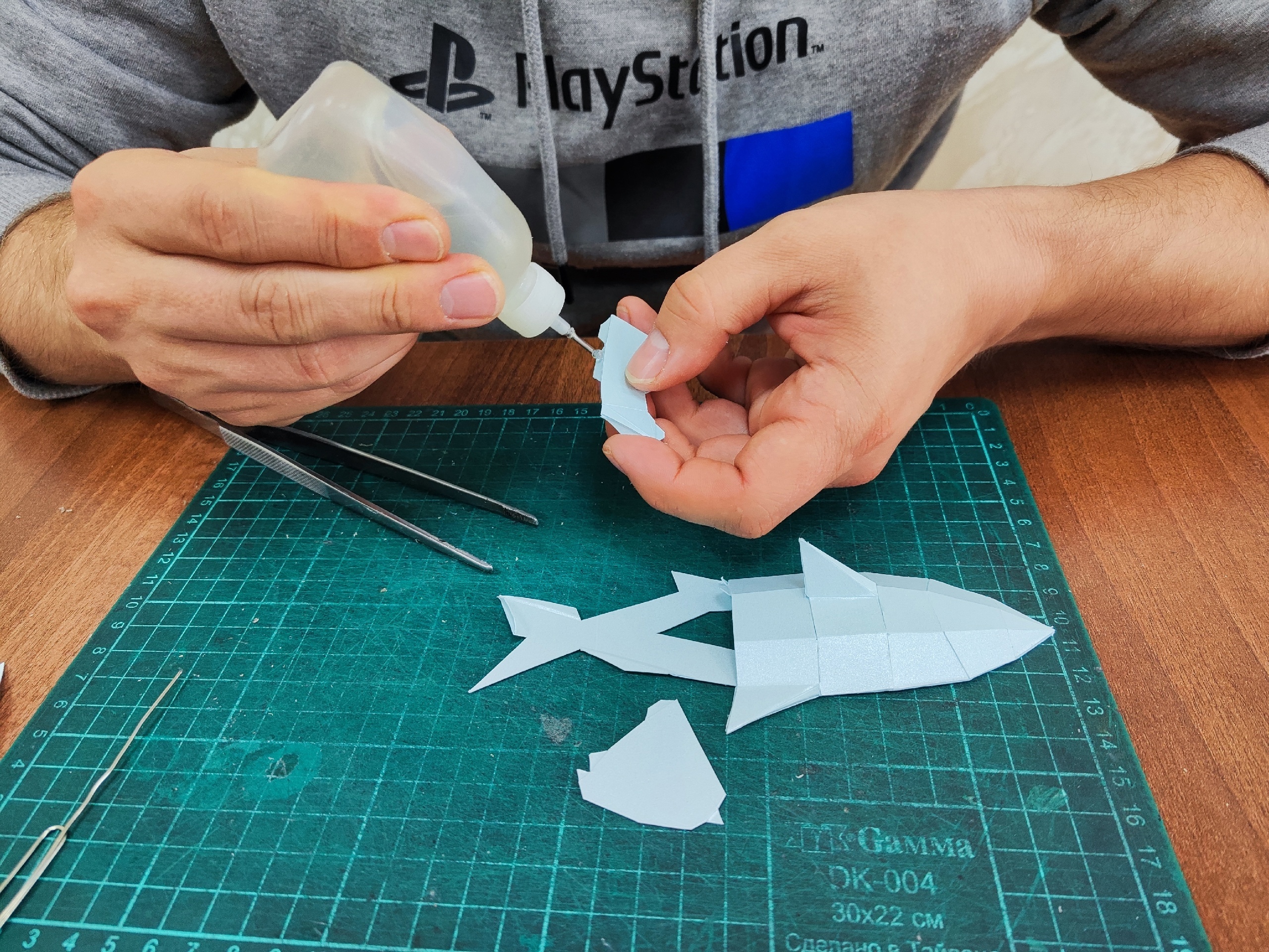 – Сначала я использовал ножницы, но с опытом понял, что скальпель гораздо лучше режет бумагу и картон, не оставляя характерных заломов, – объясняет скульптор. – Благодаря этому края всех деталей остаются ровными, а при склейке это не приводит к деформациям шва. Что же касается клея, то начинал с обычного ПВА, но потом перешёл на «Момент Кристалл» – он не оставляет пятен и быстро фиксирует детали между собой.