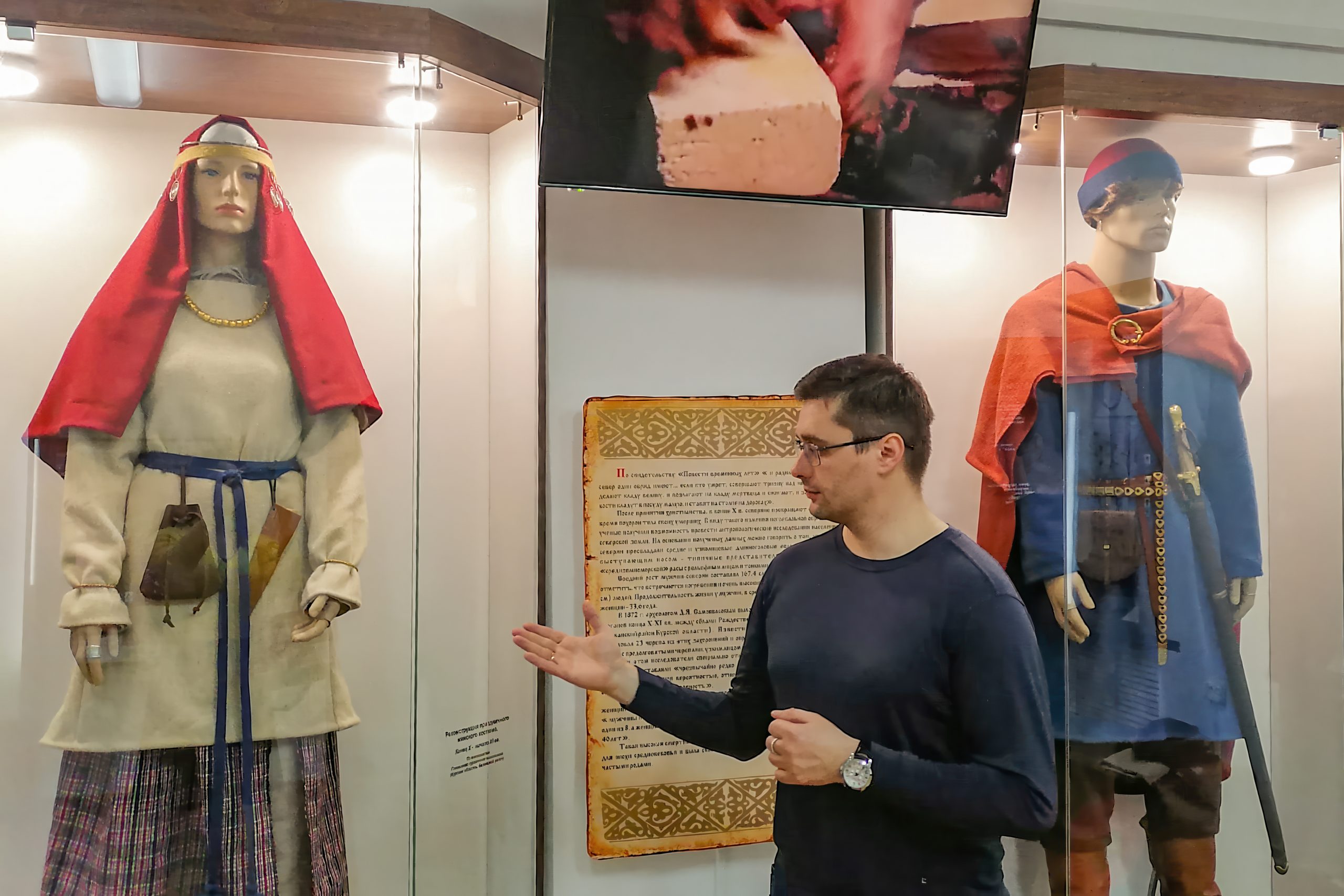 – Цельных платков на всей территории Древней Руси не обнаружено, – рассказывает историк. – У этого головного убора есть интересные декорирующие элементы, куда можно было как-то заправлять платочек или вплетать ленты. Если появятся данные об этом, переделаем экспозицию под более новые научные знания. Замужние женщины покрывали волосы платком, цвета были разные. Здесь можно было наблюдать красные, зелёные, оттенки горчичного. Синий краситель был более дорогим, а синяя одежда – более статусной. Помимо основного платка голова обёрнута шёлковым платком. Поверх него – шерстяной. Сверху надевался головной венчик и крепились височные кольца.