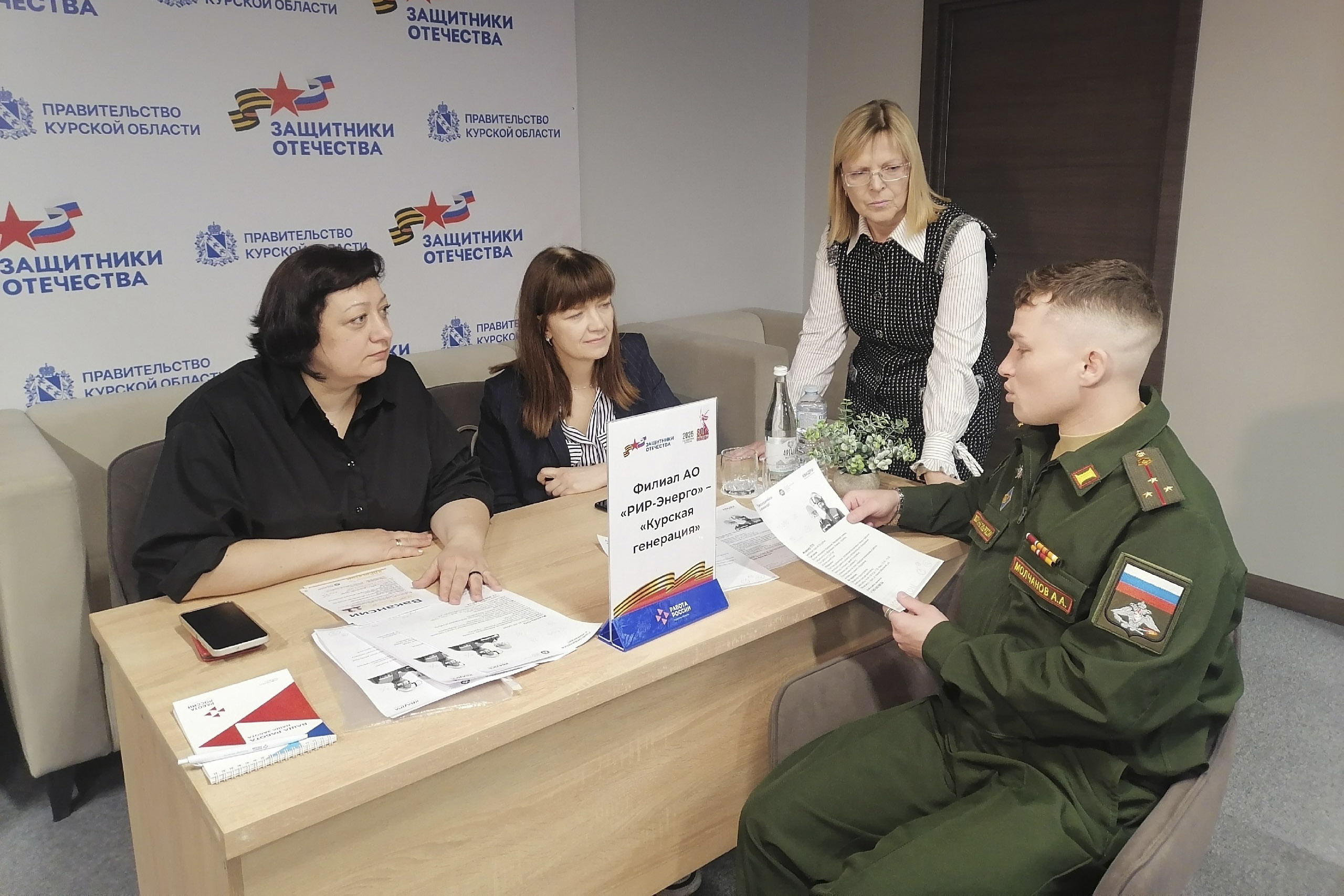 Ветеран с позывными «Курск» и «Петрович» присматривает для себя вакансии руководителя, ведёт активную общественную деятельность. На ярмарку вакансий он пришёл с флагом, на котором просит здесь же расписаться бойца с позывным «Лесник».