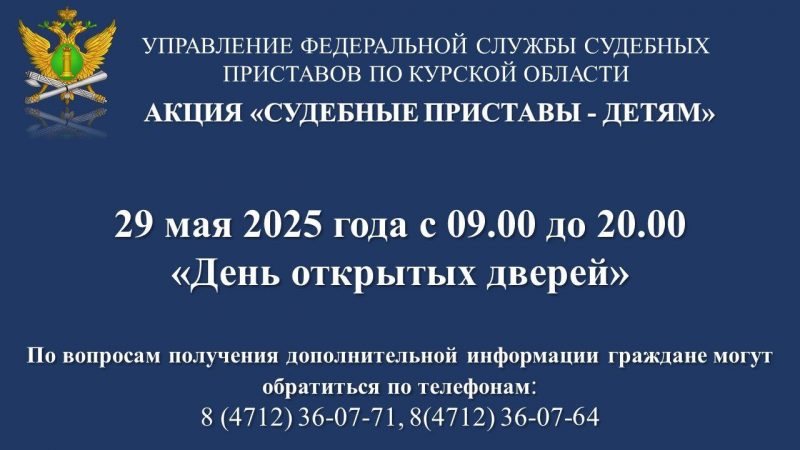 Судебные приставы Курской области приглашают жителей региона на День открытых дверей. Он состоится в четверг, 29 мая, с 9.00 до 20.00. Куряне смогут задать свои вопросы по взысканию алиментов, а также получить консультации по защите прав детей.