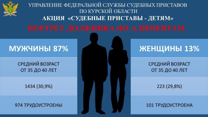 К 1 мая на исполнении в службе судебных приставов Курской области находилось 5390 исполнительных производств о взыскании алиментов с 4939 должников. Среди тех, кто не спешит рассчитываться с долгами, превалируют мужчины — 86,9% от общего числа исполнительных производств.