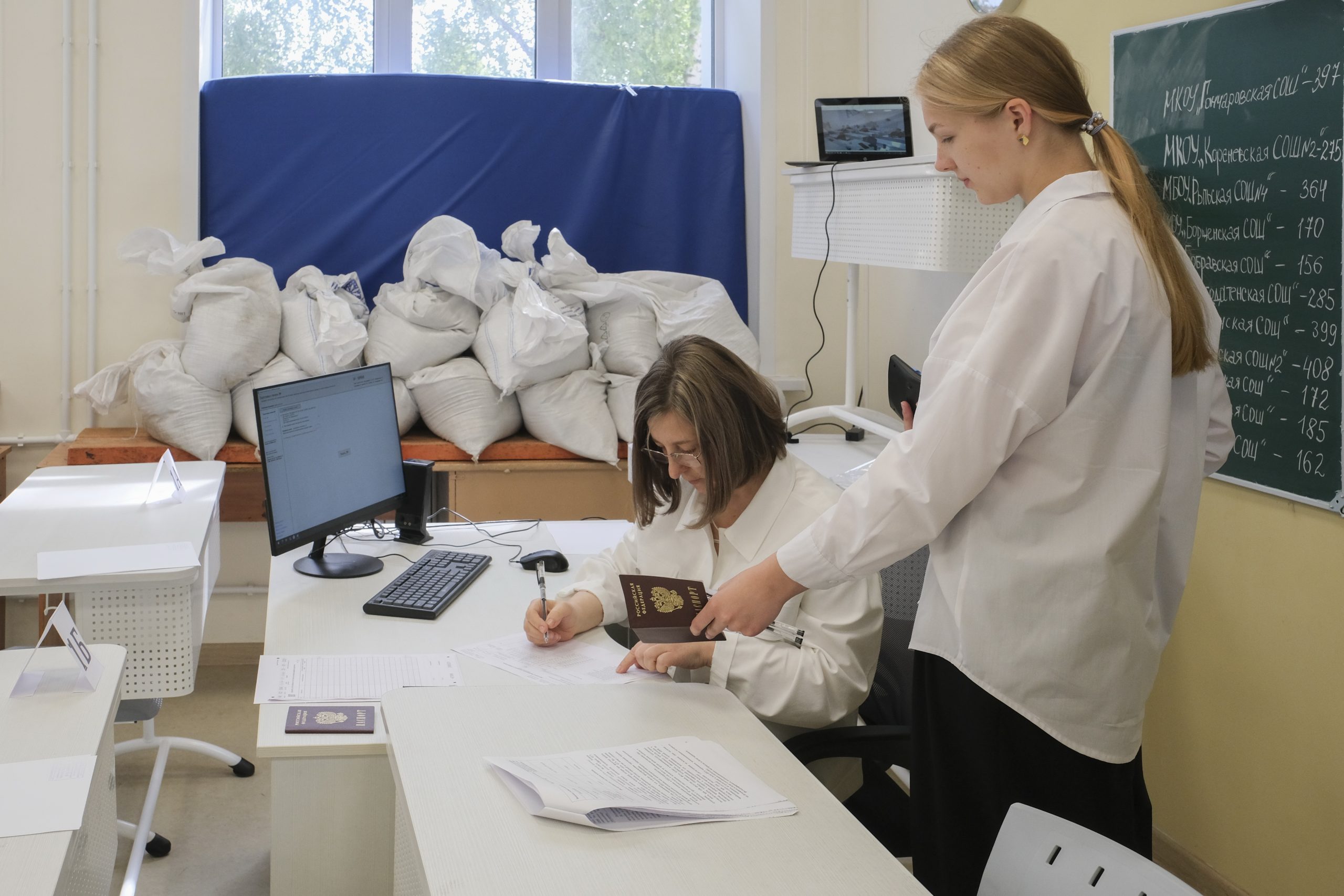 Окна в аудиториях, где проходили экзамены, оклеены бронеплёнкой и защищены мешками с песком и матами. Укреплять аудитории помогали и родители лицеистов, и сами выпускники.