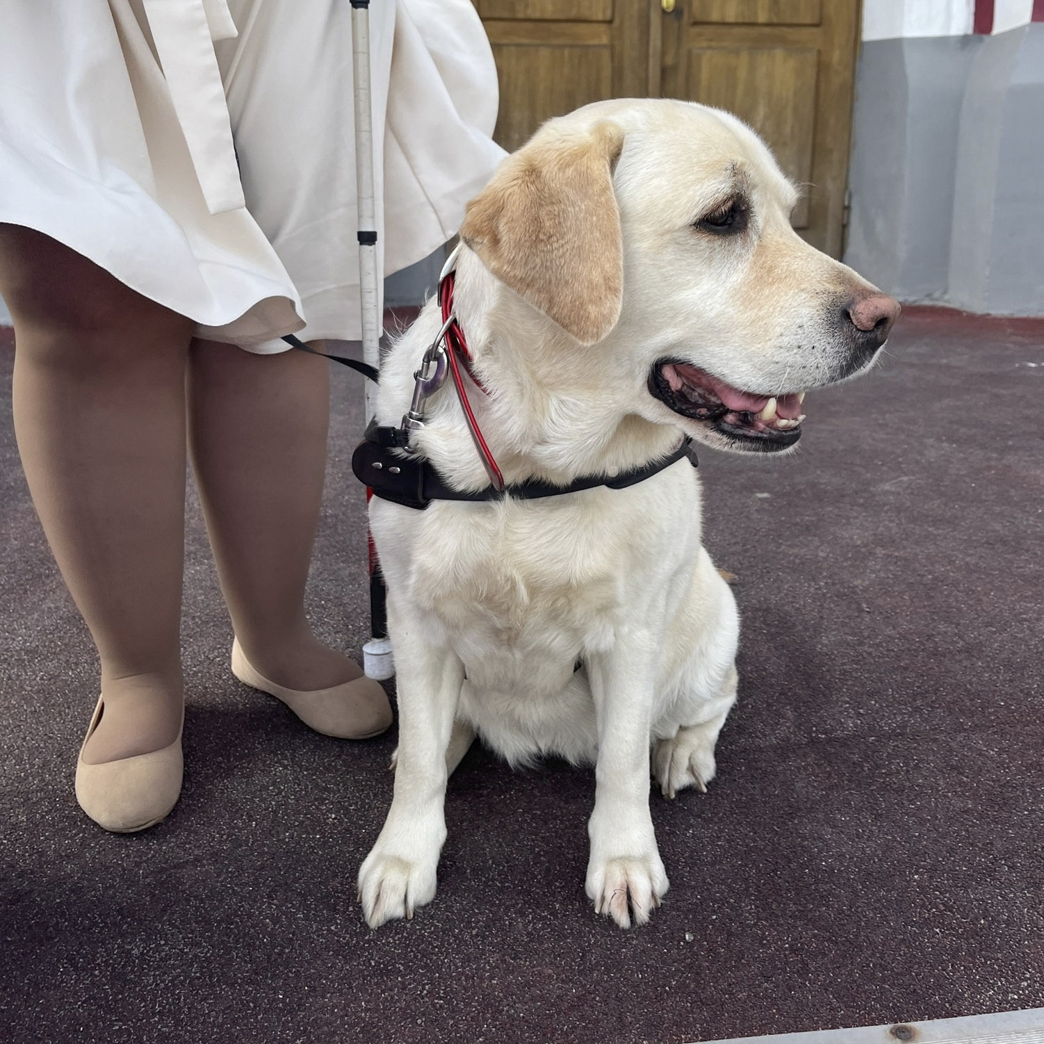Лабрадору Усману (ему больше нравится, когда его называют Усяша) уже год. Любимые команды – «кушать» и «вперёд». Любимый маршрут – школа. На концерт он пришёл со своим хозяином. 36-летний Андрей потерял зрение в 2019 году из-за осложнения после болезни.