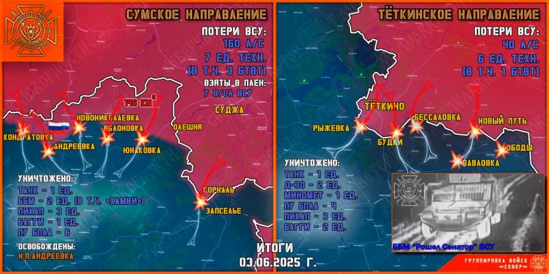 Вчера, 3 июня, в первой половине дня штурмовая группа 24 ошб «Айдар»* выдвинулась к границе РФ на направлении Рыжевка — Теткино. Армия России устранила большую часть оккупантов, выжившие бежали вглубь Сумской области. Еще одна штурмовая группа 225 ошп пыталась прорваться в Курскую область из Бессаловки. Противника встретили наши артиллеристы и операторы БПЛА, они уничтожили большую часть ВСУшников.