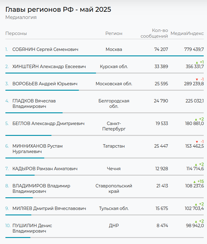 Компания «Медиалогия» подготовила медиарейтинги губернаторов по итогам мая 2025 года. Для этого компания проанализировала упоминания в более чем 104 тысячах источниках СМИ: телевидение, радио, газеты, журналы, информационные агентства и Интернет-СМИ.