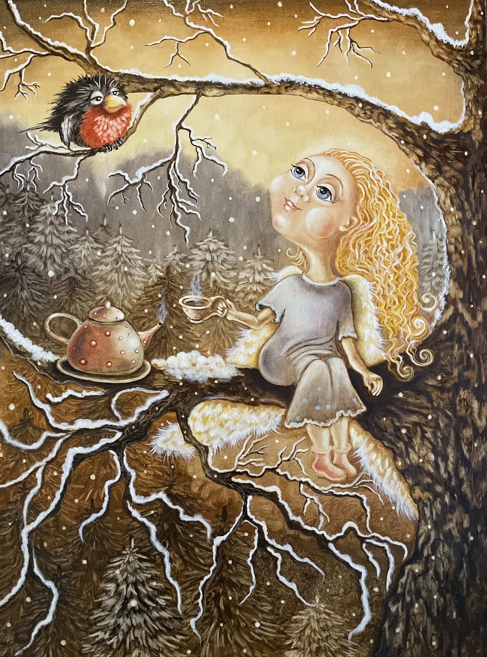 Изображены ангелы и на других картинах художницы. На одной из них он обнимает клокастого кота на фоне грозового неба. На этот сюжет Юлию вдохновила статья о волонтёрах, которые вывозят с линии фронта не только людей, но и животных. На другой картине ангел присел на заснеженной ветке попить чаю со снегирём, а вот ангел на фоне уютного осеннего сада…
