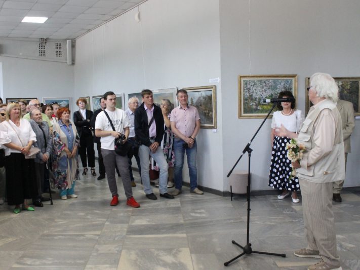 В экспозиции, расположенной в выставочном зале имени Каземира Малевича, представлено более девяноста работ, выполненных в реализме. Основная часть экспонатов — пейзажи, написанные акварелью и пастелью, а также натюрморты и гравюры. По словам художника, его картины охватывают территорию от Невы до Индигирки — это собирательный образ всей России. Всего у мастера насчитывается около трёх тысяч полотен.