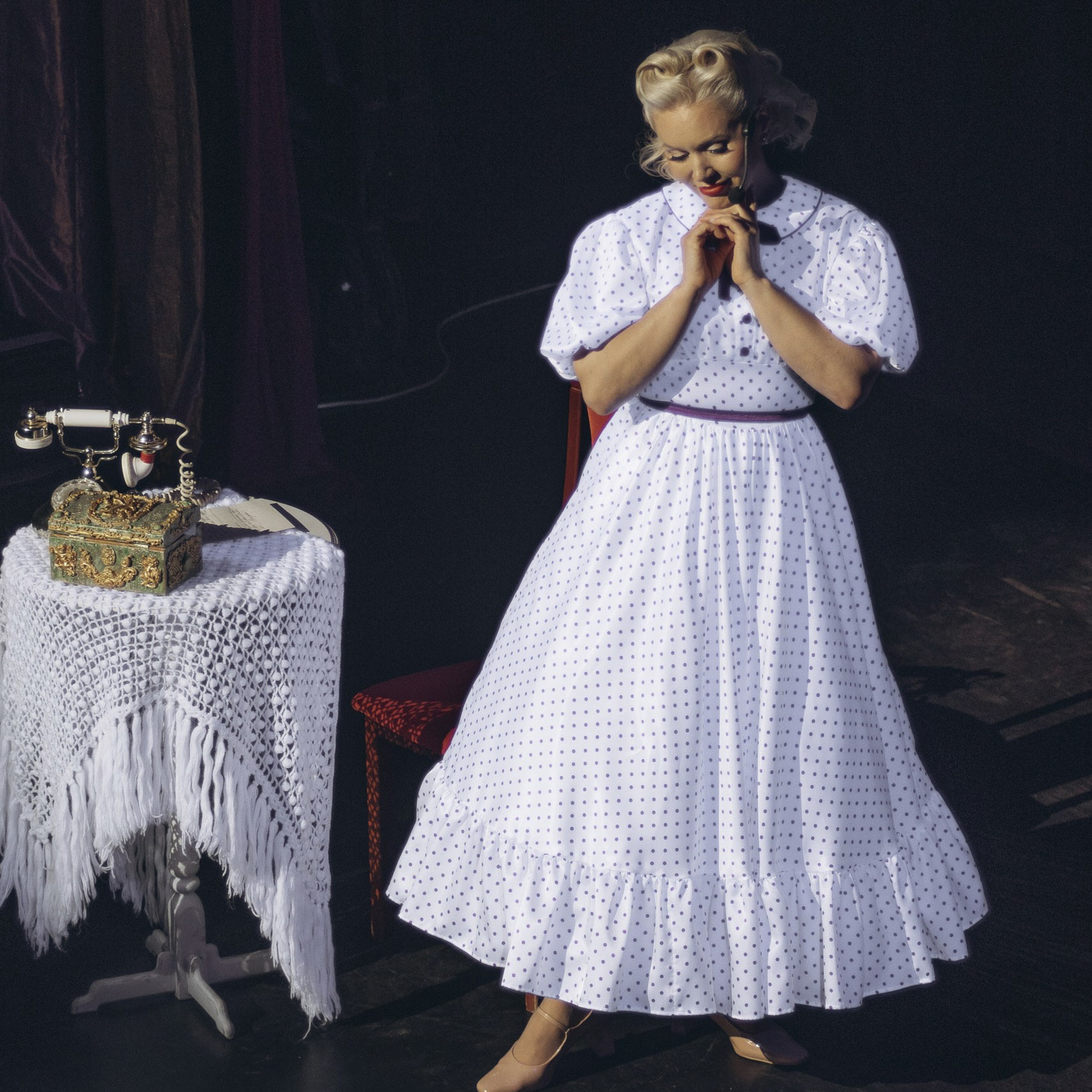 – У нас нет постановочного цеха, как в драматическом театре, нет художника-постановщика. Что-то придумываю я, что-то придумывает режиссёр Алина Воронюк. Мы с ней живём на одной волне – это редкое качество. И что придумывается, то и воплощается в жизнь. Много привнесла исполнительница главной роли – Ольга Тарабарова – очень трепетно относится к созданию образов, которые воплощает на сцене. Она очень много читала, смотрела фильмы с участием Клавдии Шульженко, фотографии. Все её костюмы, которые мы видим в спектакле, можно назвать репликами костюмов, в которых работала Клавдия Ивановна. К тому же Ольга похожа на Шульженко. Одна из афиш – это просто Оля. И причёска – это Олина заслуга.