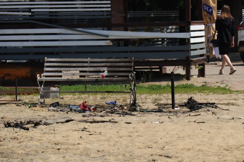 В Курске на «Городском» пляже начались восстановительные работы после ночного прилета украинского беспилотника. Рабочие расчищают территорию, убирают обломки и обгоревшие предметы.