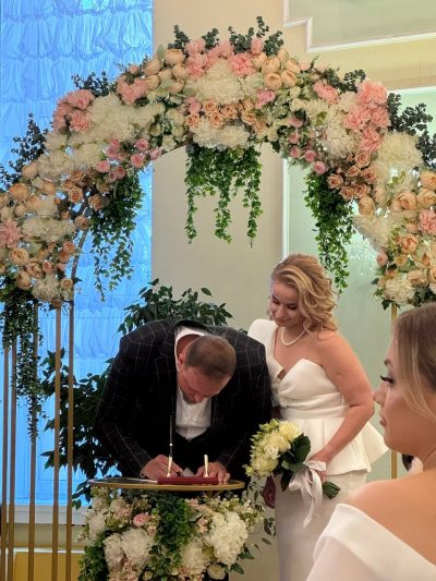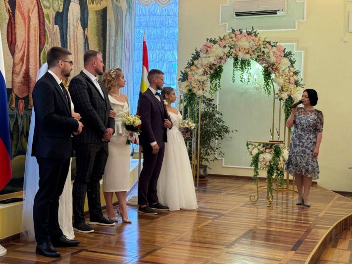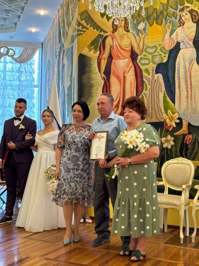 Одна из пар образовалась около года назад. Он — участник СВО, она — врач онколог. Влюбленные познакомились во время передачи гуманитарной помощи. Жених рассказывает, что сделал предложение любимой через пол года с начала отношений, но понял он, что встретил свою судьбу еще в день знакомства. Супруги выбрали дату не специально: