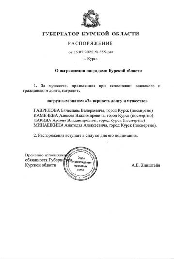 Врио губернатора Курской области Александр Хинштейн подписал распоряжение о награждении знаками «За верность долгу и мужество» посмертно четырех курян, которые погибли при недавней атаке на городской пляж. Вячеслав Гаврилов, Артём Ларин, Алексей Каменев и 5-летний мальчик Толя Минашкин погибли, помогая другим.
