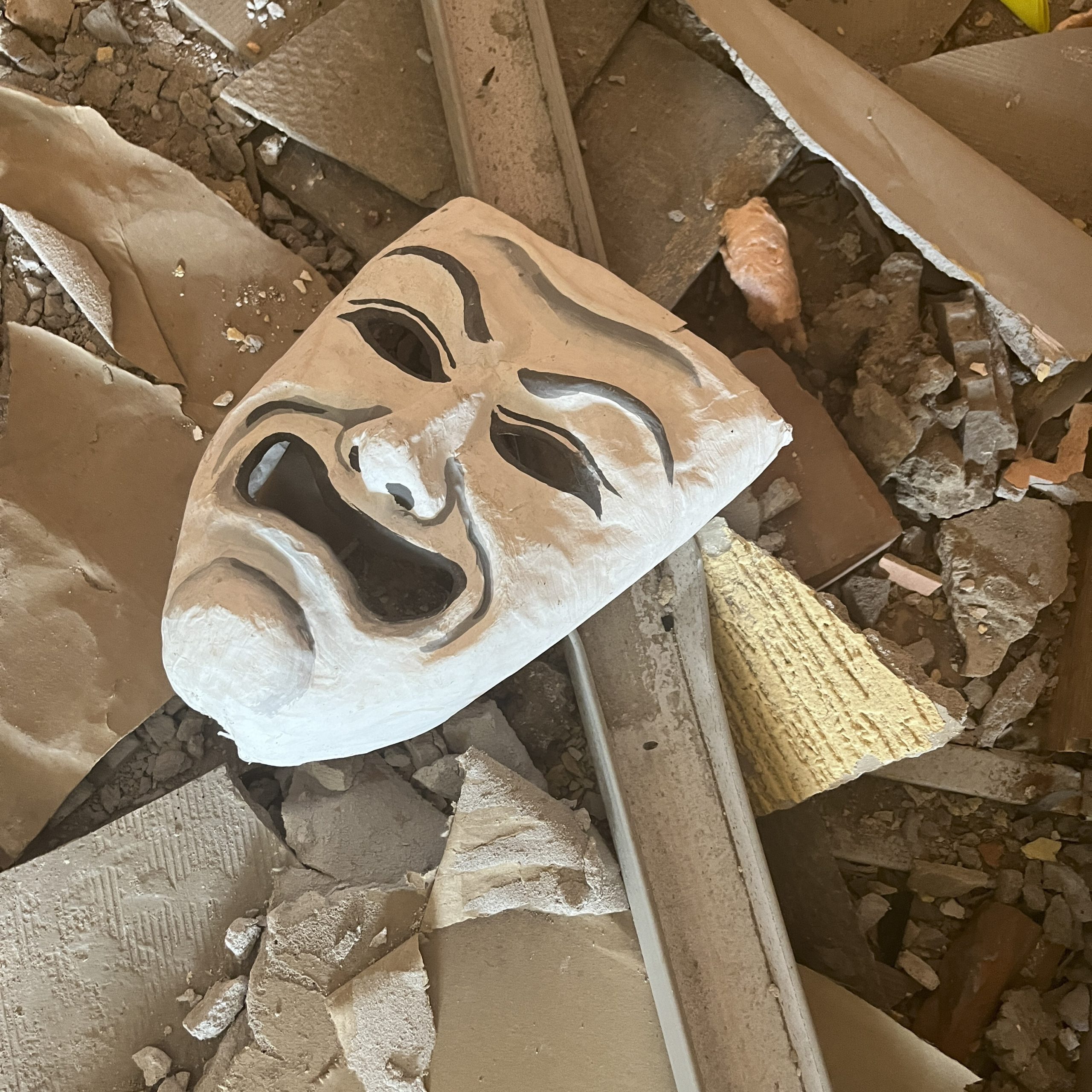 Когда-то Дом культуры был очень красив: напольная плитка раскрашена словно ковёр. Сейчас на ней стёкла и обломки. И детские работы. Взрывной волной разметало по полу и волшебного конька из ниток, и аппликации – «Зимняя сказка». Здесь же на полу символ театра – маска. Чудом сохранилась прикреплённая к стене огромная роза из фоамирана – часть декораций.