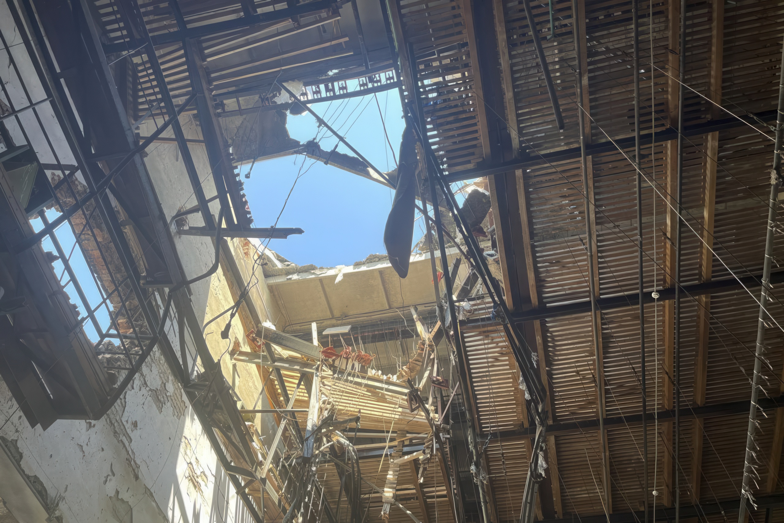 – Чудом спаслись наши художники, – вспоминает Гребенникова. – В тот день они оформляли зал и ушли буквально за три минуты до прилёта: торопились на день рождения коллеги. Пострадали те, кто был в музыкальной студии. Ударило, и они провалились в подвал: вот там, внизу, диван на котором они сидели. К счастью, спаслись и они. Но получили ранения. Женщина, которая жила здесь рядом, погибла: в момент прилёта она была на улице.