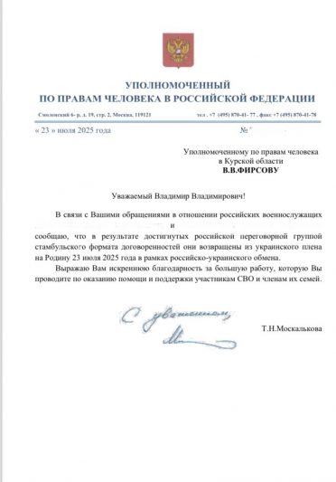 В соответствии с российско-украинскими договоренностями вчера, 23 июля, на Родину вернулась еще одна группа российских военнослужащих вернулась с подконтрольных украинскому режиму территорий. Об этом на своей официальной странице ВКонтакте сообщил уполномоченный по правам человека в Курской области Владимир Фирсов.