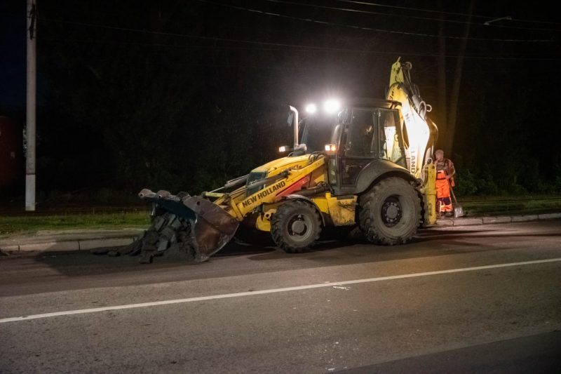 Дорожники уже срезали старое асфальтовое покрытие, которое от интенсивной эксплуатации местами уже пошло волнами. Теперь идёт укладка нового асфальтобетона. Чтобы не осложнять движение, работы вели в тёмное время суток.