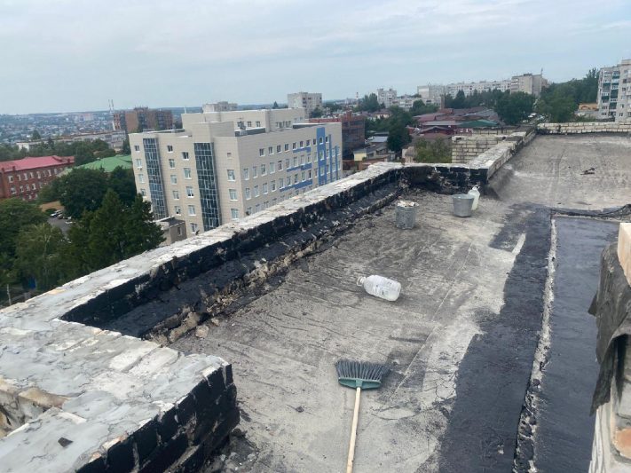 В Курске продолжают ремонтировать дома после атак ВСУ. В многоквартирном доме на улице Димитрова, 37, в месте повреждения кровли специалисты восстановили плиты перекрытия, вентиляционные шахты, производят работы по устройству наплавляемого покрытия в два слоя и примыканий.
