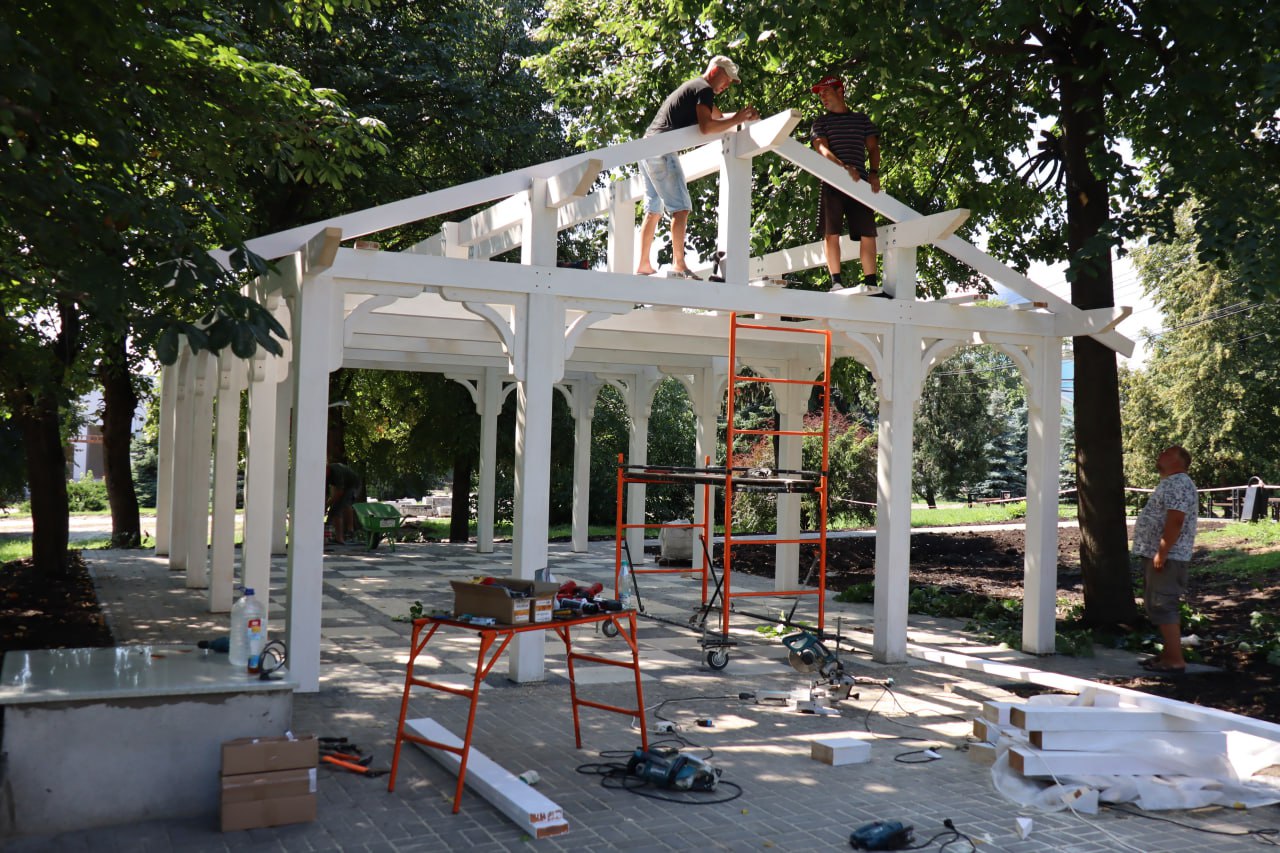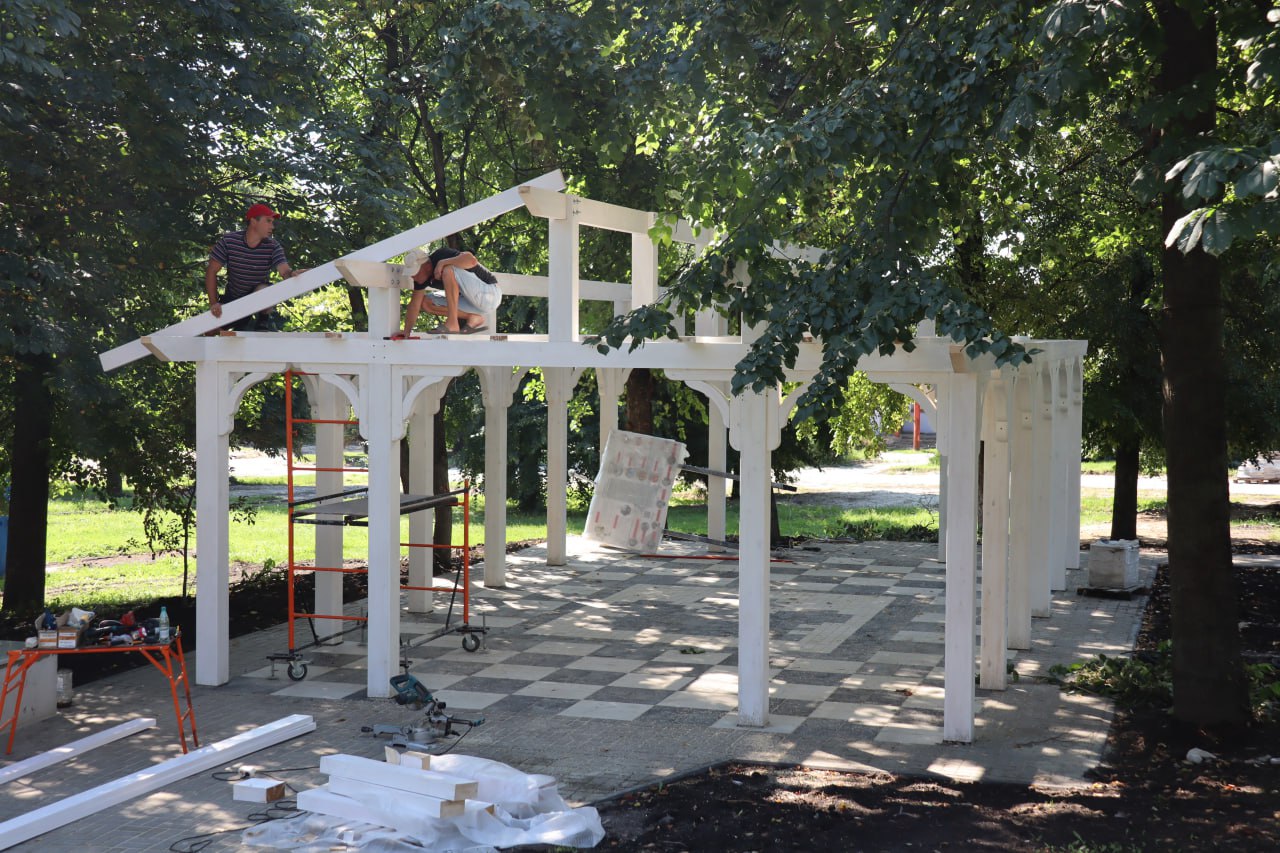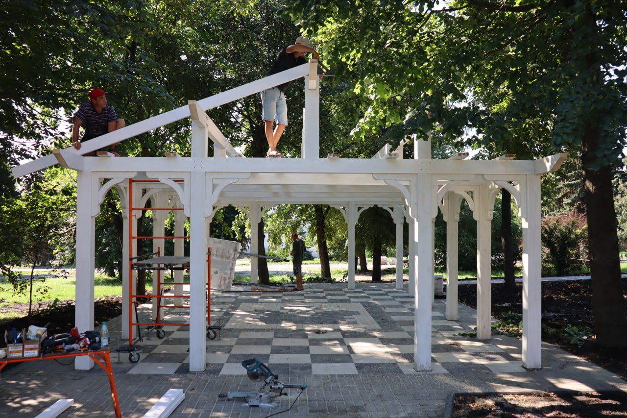 Курянам показали как идут работы по установке беседки для шахмат в парке имени 1 Мая.