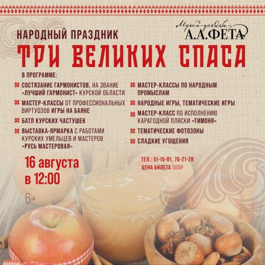 16 августа в музее-усадьбе А.А. Фета состоится традиционный народный праздник «Три Великих Спаса». Начало в 12.00.