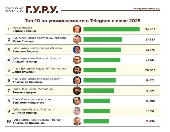 Аналитический центр «Г.У.Р.У.» опубликовал релиз «Индекс Telegram. Рейтинг эффективности публичных политиков через призму Telegram. Август 2025». С помощью нейросетей авторы собрали все публикации с упоминанием губернаторов в Telegram-каналах.