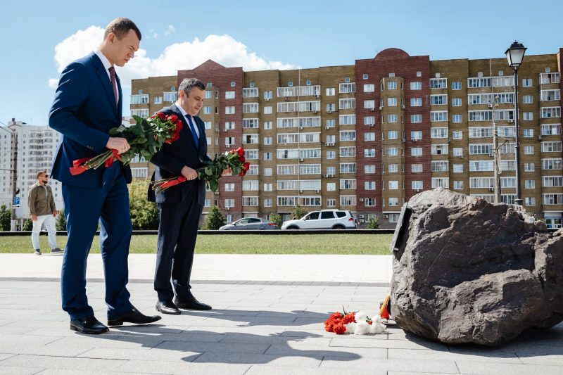 Сегодня, 13 августа, в Курск с рабочим визитом приехал министр спорта России, президент Олимпийского комитета РФ Михаил Дегтярев. Вместе с врио губернатора Курской области Александром Хинштейном они почтили память бойцов, которые ценой своей жизни защищали рубежи России в годы Великой Отечественной войны и сейчас в зоне проведения СВО. Они возложили цветы к мемориальному комплексу «Курская дуга» и закладному камню, где будет установлен памятник героям, спасавшим мирных жителей от агрессии украинского режима.