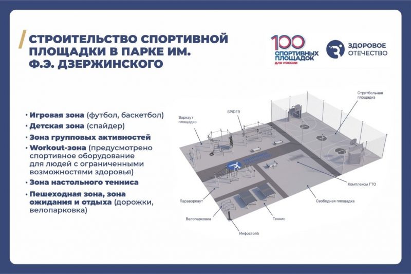 Проект спортплощадки реализуется Общероссийским общественным движением «Здоровое Отечество», с которым было подписано соглашение на Петербургском международном экономическом форуме. Работы ведутся в рамках проекта «100 спортивных площадок России».