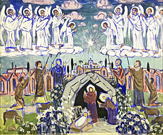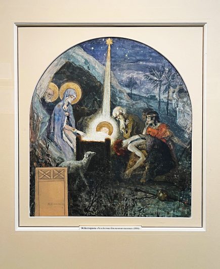 Многие работы, представленные на выставке, основаны на библейских сюжетах. В 1890 году Нестеров создаёт эскиз росписи алтарной стены Владимирского собора Киево-Печерской лавры – «Рождество. Поклонение волхвов», в котором художник исполнил две запрестольные композиции: «Рождество» и «Воскресение». Он уменьшил глубину сцены, акцентировал силуэты и звучность синих тонов, отказавшись от более традиционных коричневых. Всё это определило особенности нового стиля, по которому в дальнейшем пошла церковная академическая живопись.