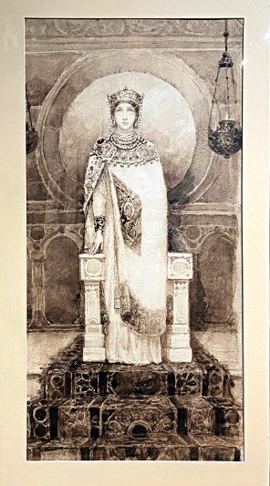 «Святая великомученица Елена» – работа Вильгельма Котарбинского. В левой нижней части рисунка видна монограмма «ЕАП». Так художник маркировал работы, посвящённые Елене Адриановне Праховой. Той самой «Лёльке», черты которой критики усмотрели в Святой Варваре Нестерова.