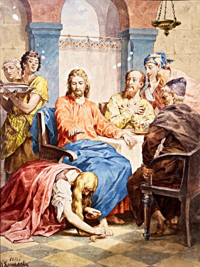 «Омовение ног Иисуса в доме Лазаря» – работа Николая Кошелева. Художник обладал многогранным талантом, писал портреты, жанровые и исторические картины. Но особенно ярко проявил себя в эскизах росписей Храма Христа Спасителя в Москве, храма Спаса на крови в Санкт-Петербурге. Он участвовал в реставрации росписей главного купола Исаакиевского собора в Санкт-Петербурге.