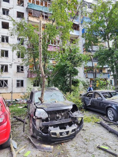 Во дворе – сгоревшие дотла, а также разбитые машины. Один автомобиль пробило большой веткой, которую сорвало с дерева от взрывной волны. Всё вокруг усыпано осколками битого стекла, кусками железа и пластика. В доме на Союзной на четырёх верхних этажах квартиры выгорели, а балконные каркасы местами вырвало.