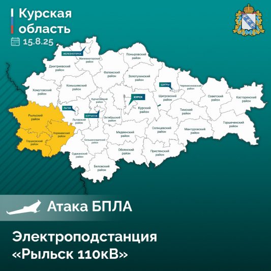 В светлое время суток неприятельский беспилотный летательный аппарат атаковал электроподстанцию «Рыльск 110 кВ» в городе Рыльск. В результате атаки был повреждён кабель, что привело к перебоям в подаче электроэнергии в Рыльском, Глушковском и Кореневском районах, которые подключены к Рыльской подстанции.
