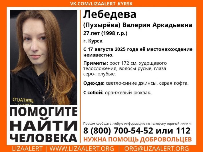 В Курске пропала 27-летняя местная жительница. Лебедева, она же Пузырева Валерия Аркадьевна, перестала выходить на связь 17 августа, с этого момента ничего не известно и о ее местонахождении.